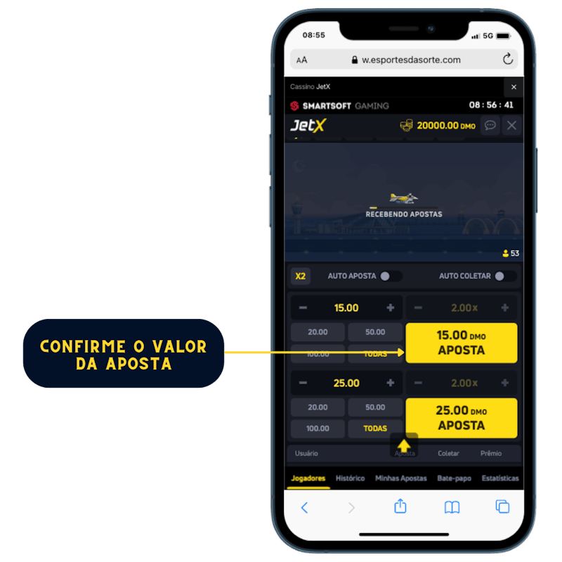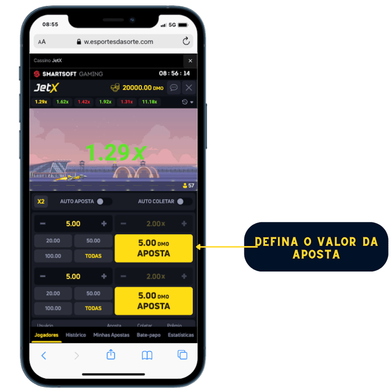 Após acessar o jogo, selecione o valor que você quer apostar na rodada. Você pode fazer 1 ou 2 apostas ao mesmo tempo e os valores das apostas podem ser iguais ou não.