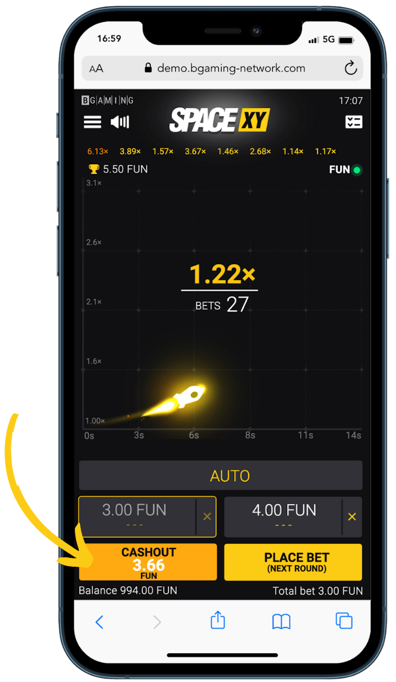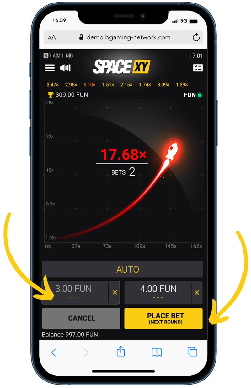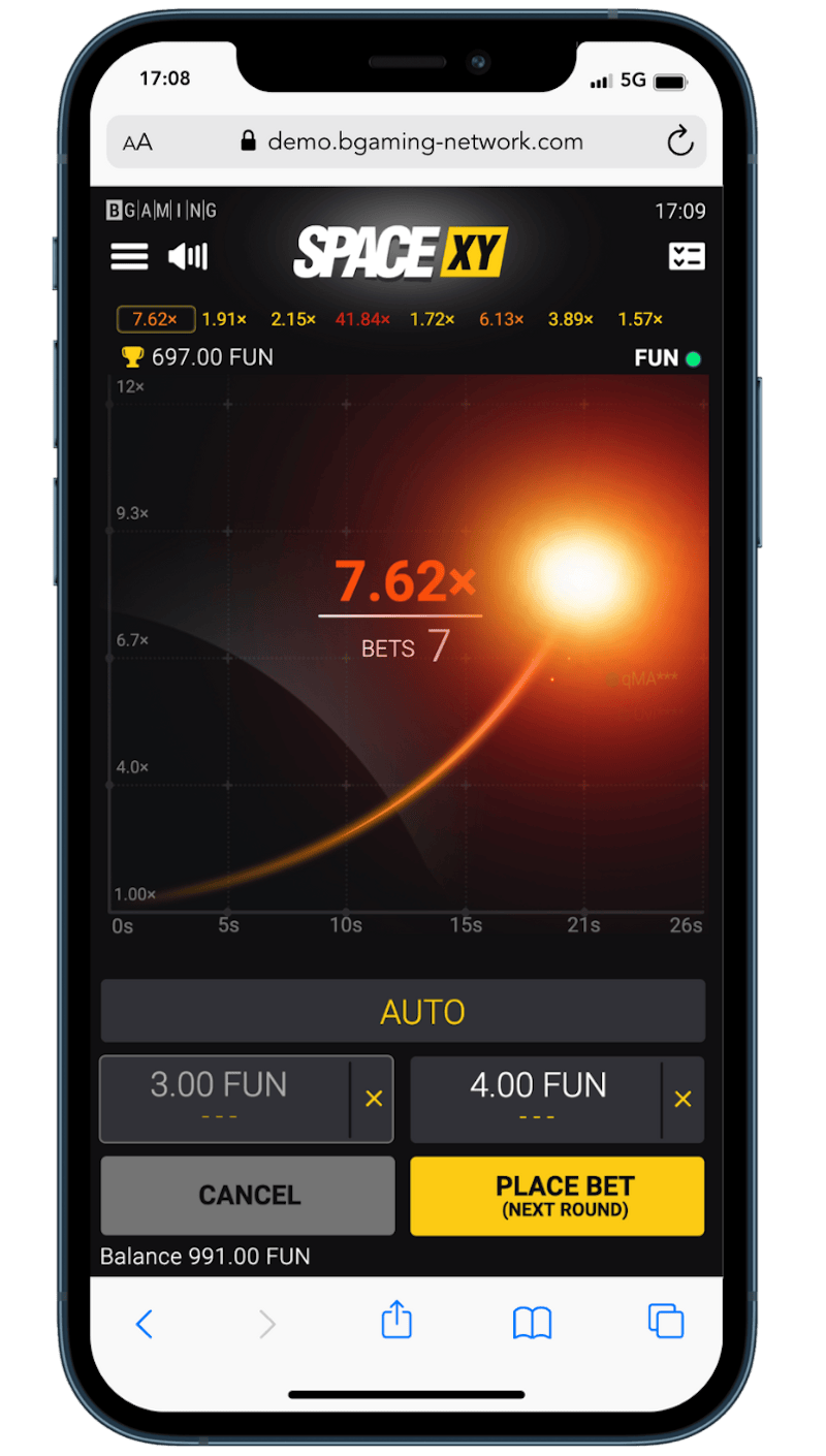 O jogo Space XY é o jogo Crash da BGaming, os jogadores fazem as apostas enquanto assistem ao foguete subir no gráfico. A coordenada X (horizontal) indica o tempo que o foguete está no ar, enquanto a coordenada Y (vertical) mostra os valores do multiplicador de aposta.